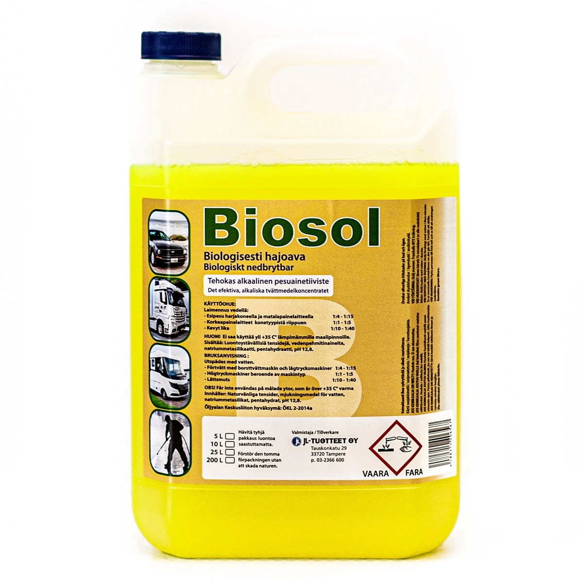 Raskaan kaluston pesuun tarkoitettu alkalinen ja täysin biologisesti hajoava pesuainetiiviste. Biosolilla hoituu vaativampikin puhdistus nopeasti ja luontoa säästäen. Öljyalan keskusliiton hyväksymä tuote: ÖKL 2-2014a