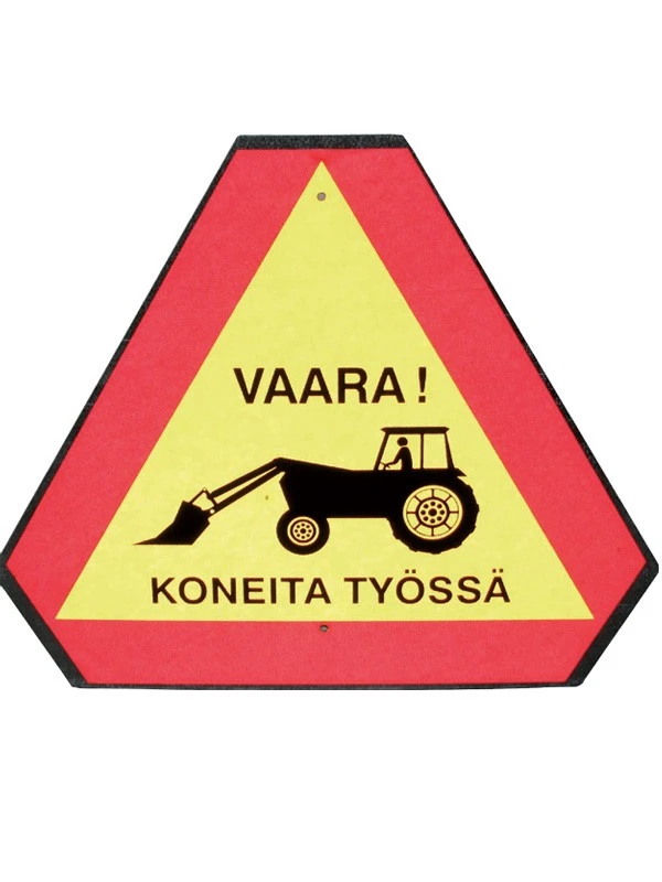 Vaara! Koneita työssä – varoitusmerkki, materiaali peltiä.