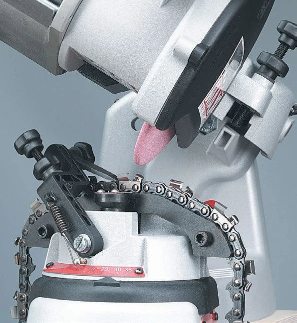 Moottori käännetään laitteen oikealle kyljelle. Teräketju lukitaan paikalleen ketjupidikkeellä. Teroituskulman säätö tapahtuu laitteessa olevan asteikon avulla. Oikeakätiset hampaat teroitetaan yksitellen ketjua vetäen.