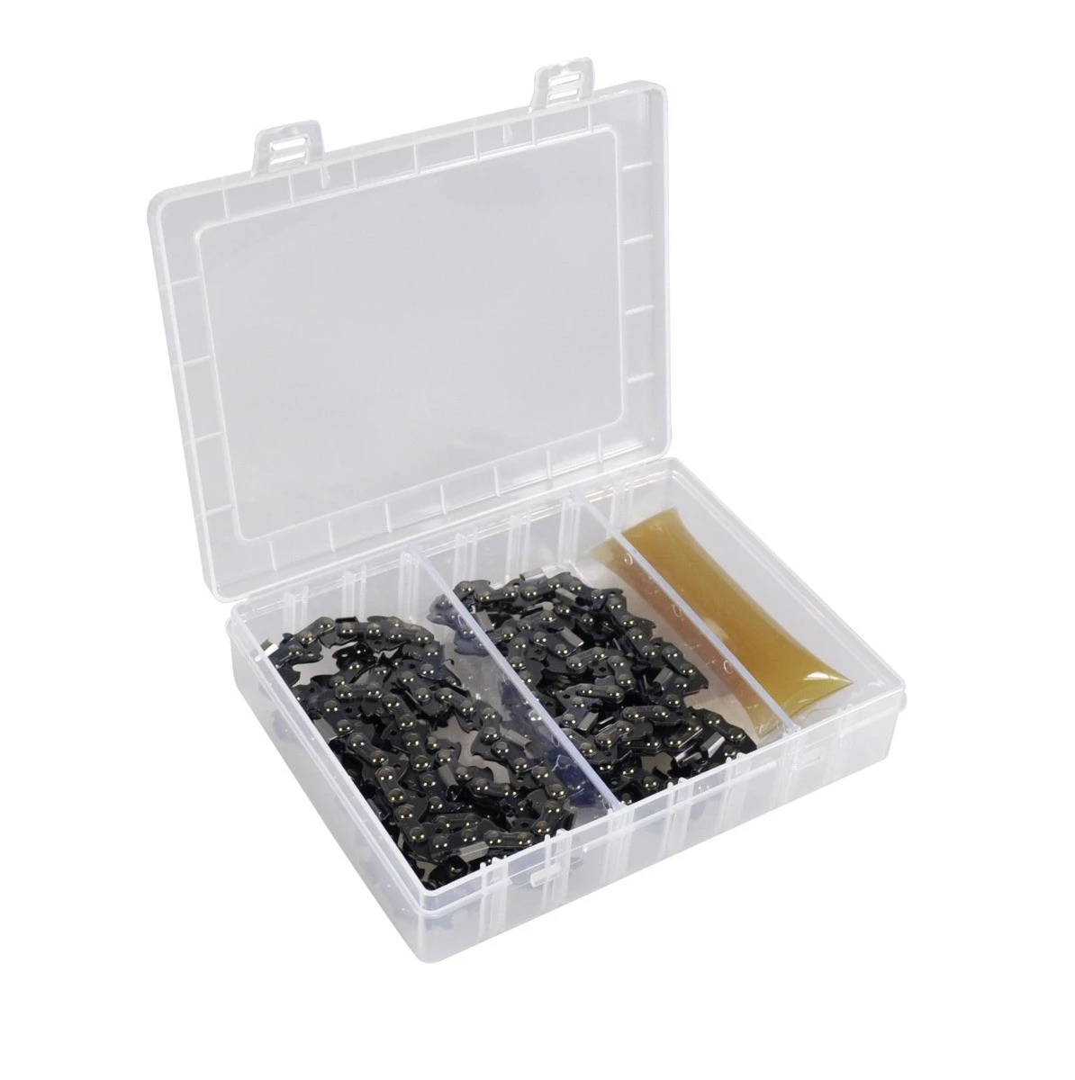 Muovinen säilytysrasia esim. varaosien ja teräketjujen säilytykseen. 2 siirrettävää väliseinämää.