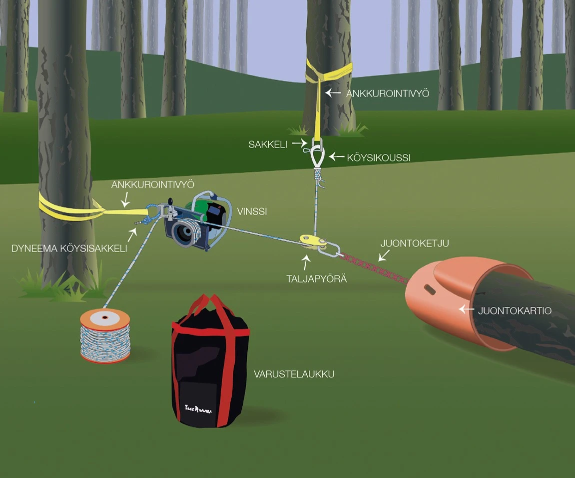 - Käytä aina kun mahdollista juontokartiota tai vastaavaa alustan kitkaa ja takertumisvaaraa pienentävää apuvälinettä.